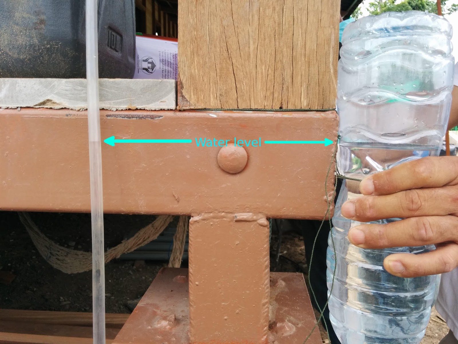 It is just a plastic water bottle turned upside down with a hole drilled through the cap that allows a clear plastic tube to fit snugly inside. A small air hole is drilled in the other end (used to be the bottom of the bottle, but now that the bottle is upside-down it is facing up). The land is quite large, so I’m using about 30m of tubing. You have to fill up the tube with water and get all of the air bubbles out.