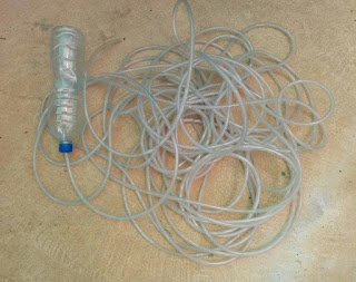 Tip: I found that filling it up with water by sticking the other end of the tube inside a small garden hose and jamming it up about a 1-2 meters into the hose allows the hose to fill it up easily and pushes all the bubbles out at the same time. Watching it is actually like a children’s game of sorts as you watch the end of the water race through the tube along the ground around the loops and all the hairpin turns. (I’ll take my amusement where I can get it.)