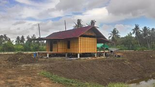 So the first house is looking nearly complete now. Pilings, balcony, floor (not including tiles), walls (including interior), and roof are all done. Have a look: