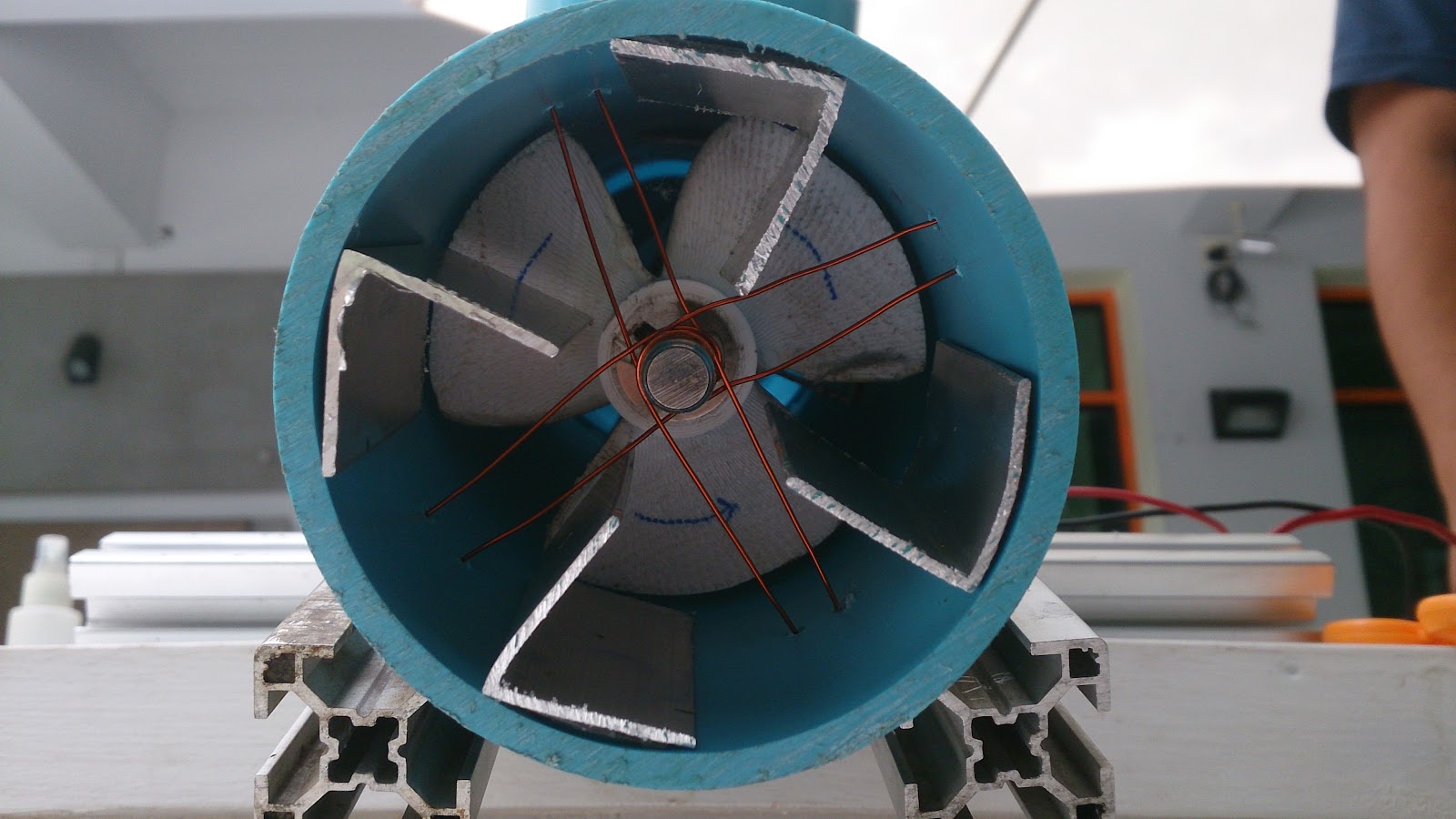 When we tested in this configuration, not much happened. The head level was just a couple of centimeters. This led me to think that the impeller was acting more like a blender just spinning the water around inside the PVC pipe, so we added simple aluminium “blades” to guide the water flow and resist “spinning”.