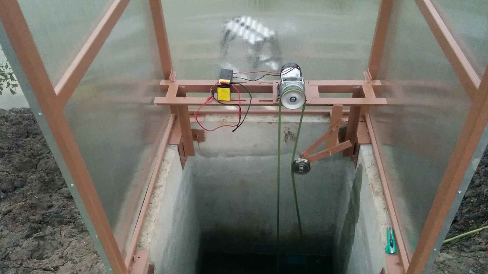 The motor we chose to use is a 24V DC geared motor. We’ve attached it to a welded metal platform on top of the cement cistern, and then are using a basic rubber vee belt to drive the pulley connected to the impeller that sits inside the water.
