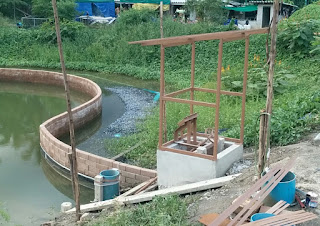 You get a bit of an idea about the layout by looking at the bottom picture. The motor is mounted inside the “pump shack” that is being built and drives the long tail shaft by a belt. (Pulley is visible in the top picture.) The shaft extends downwards at a 45 degree angle and enters the back of the PVC pipe (unfortunately the water level has already risen to the point that you can’t see it). The PVC pipe has a 45 degree angled connection between the vertical section (visible in the middle picture) and the lower section (hidden under water) which contains the impeller. Thus, once the water level rises above the top, water would be sucked in from the top and expelled at 45 degrees downwards into the pond. I am also hoping that this 45 degree downwards outflow will help create a vertical circulation so that surface water moves down to the depths of the pond and water at the bottom eventually surfaces. It is best not to have stagnant water sitting anywhere in the pond for long periods of time.