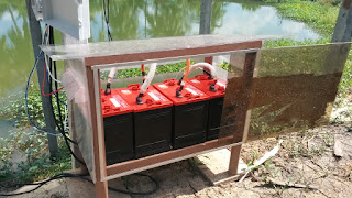 Each one is rated at 6V and 225Ah (for a 20hr discharge rate), and they weigh about 28kg (62 lbs) each. They are normally used for golf carts. There are 4 of them in series for 24v, 5.4kWh. You can see a piece of brown acrylic we had left over from tinted lighting windows in the house used as a sliding door. When it slides into place, the little battery cabinet is mostly rain proof. Nonetheless, it has air vents on 3 sides to let gas escape since lead acid batteries produce hydrogen gas when charging.