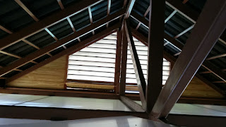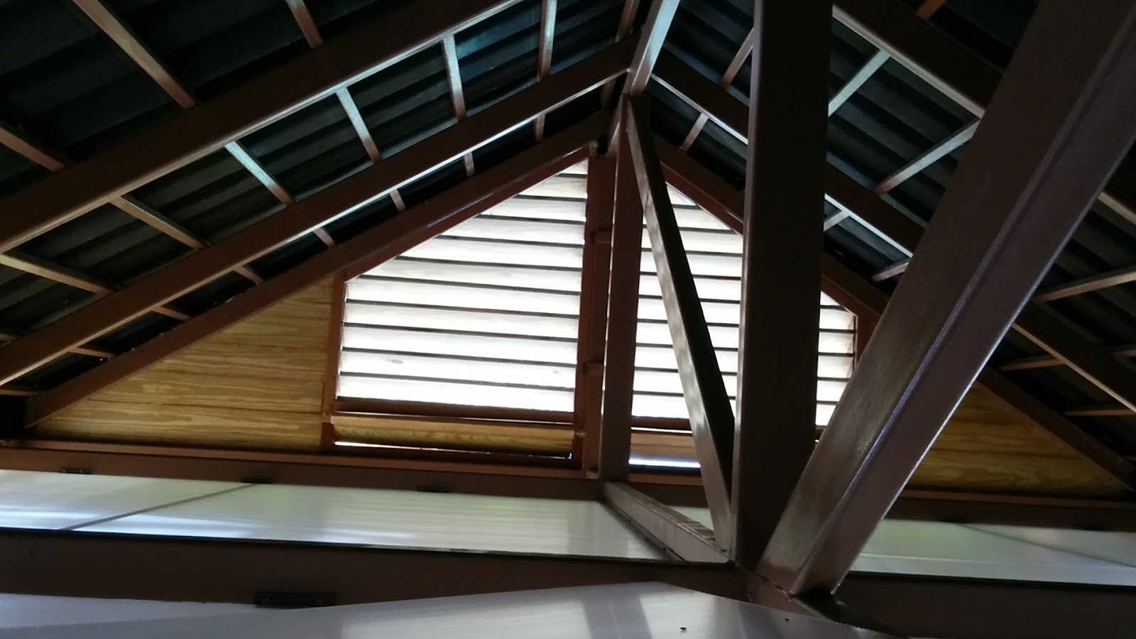 The interior ceiling is uncolored polycarbonate and is semi transparent so that water leaks and critters crawling around can be easily identified from the rooms below and remedied as soon as possible. It is very light and easy to push open from below to gain access to the attic space (with the help of a ladder, of course). On a recent windy day, I climbed up here for the first time, and sure enough the wind blew through the attic about as strongly as it was blowing outside. This made me pretty happy.