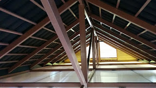 The wind tunnel effect seemed to work pretty well since the steel structure (which supports the tiles) measured at 49C and the polycarbonate ceiling (underside) measured at 39C. This is a 26 degree (C) temperature differential (47F) between the south facing hot tiles and the polycarbonate at the bottom of the attic.