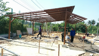 In addition to beginning the roof on BaanRimNaam today, we also started putting up the roof on the parking area. We went with a semi-transparent polycarbonate sheeting. Here are a few pictures: