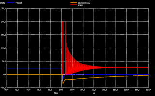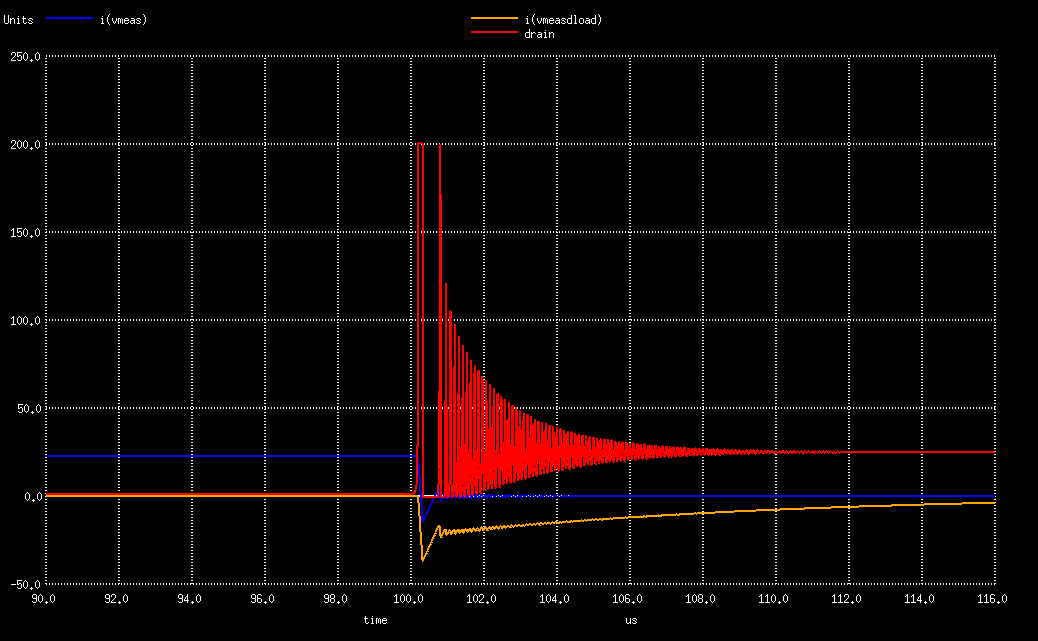 Notice the 200V spike followed by very high frequency ringing for about another 10us. Now this is a reasonable approximation of the problem we are seeing in the real circuit. And since the FETs we are using have max voltage ratings between 100V and 200V, this spike clearly has the potential to cause problems.