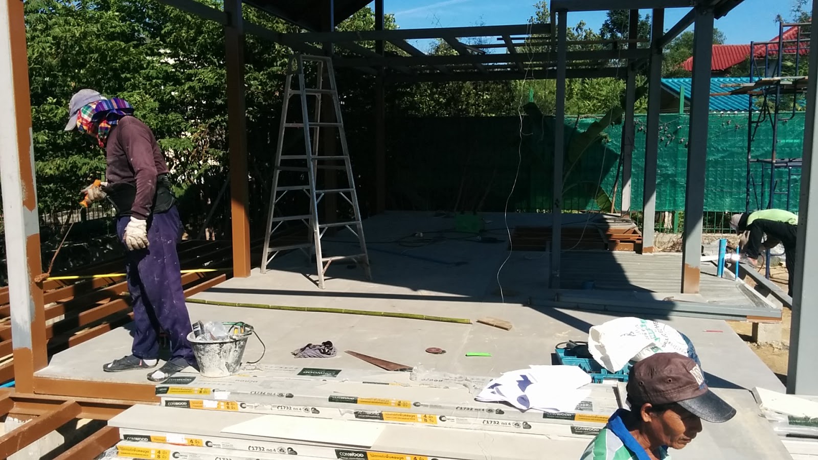 Now that the house frame and roofing is in place, the fiber cement board flooring is going in.