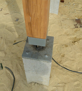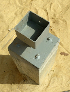 Basically, the idea is rather than rest the posts directly on the cement footing, one can build a steel box for the wooden posts that the end of the posts fit cleanly into and then make those steel boxes “float” over the cement footing by having a smaller steel rod hidden underneath to hold it up.