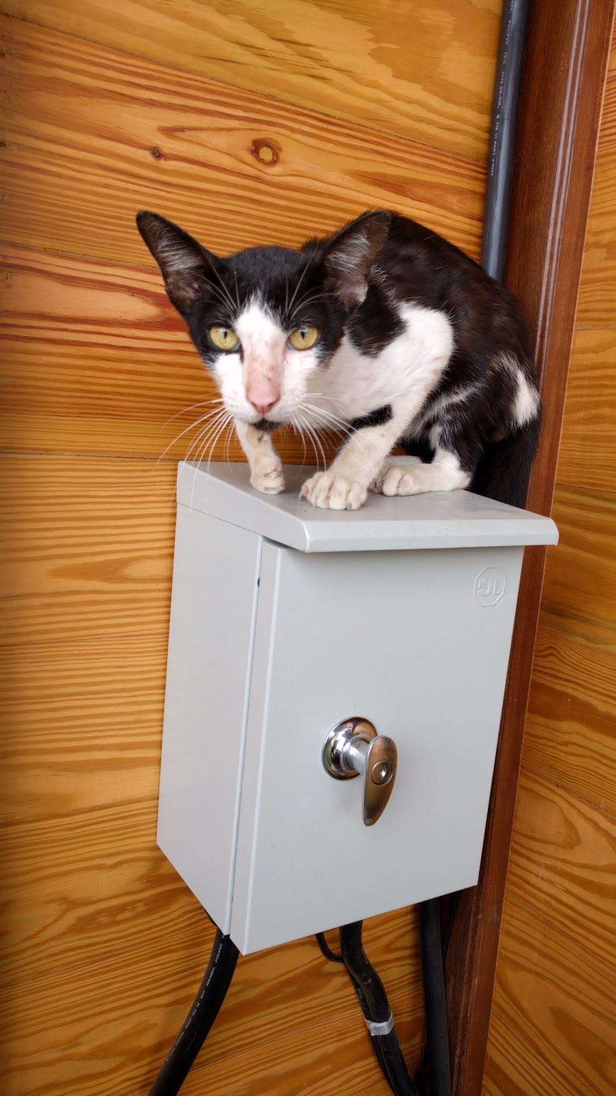 Keep in mind that a pack of about 4 dogs sleep directly below where this cat was hanging out. So we were a little afraid for the cat’s life. But based on how skinny he is, I think it was desperation and a risk of starvation that caused him to brave the dogs. But the reason he was hanging out on top of this box was probably that it was the safest spot out of the dogs’ reach.