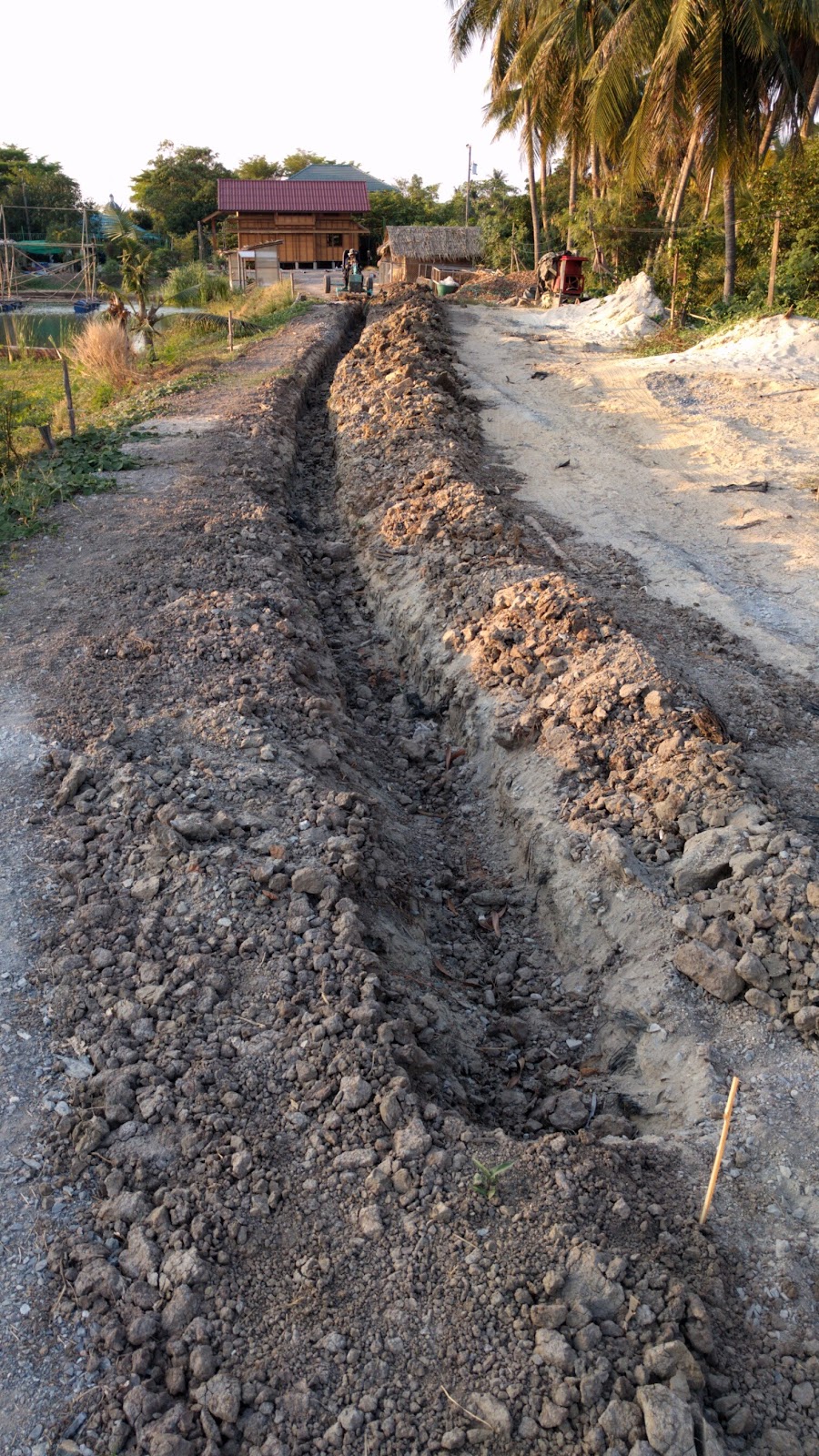 K’Tanawat has been digging the long trench from the front of the land to BaanRimNaam and the going has been slow and tough. Until he tried using a hose to soak the end of the trench where he is digging.