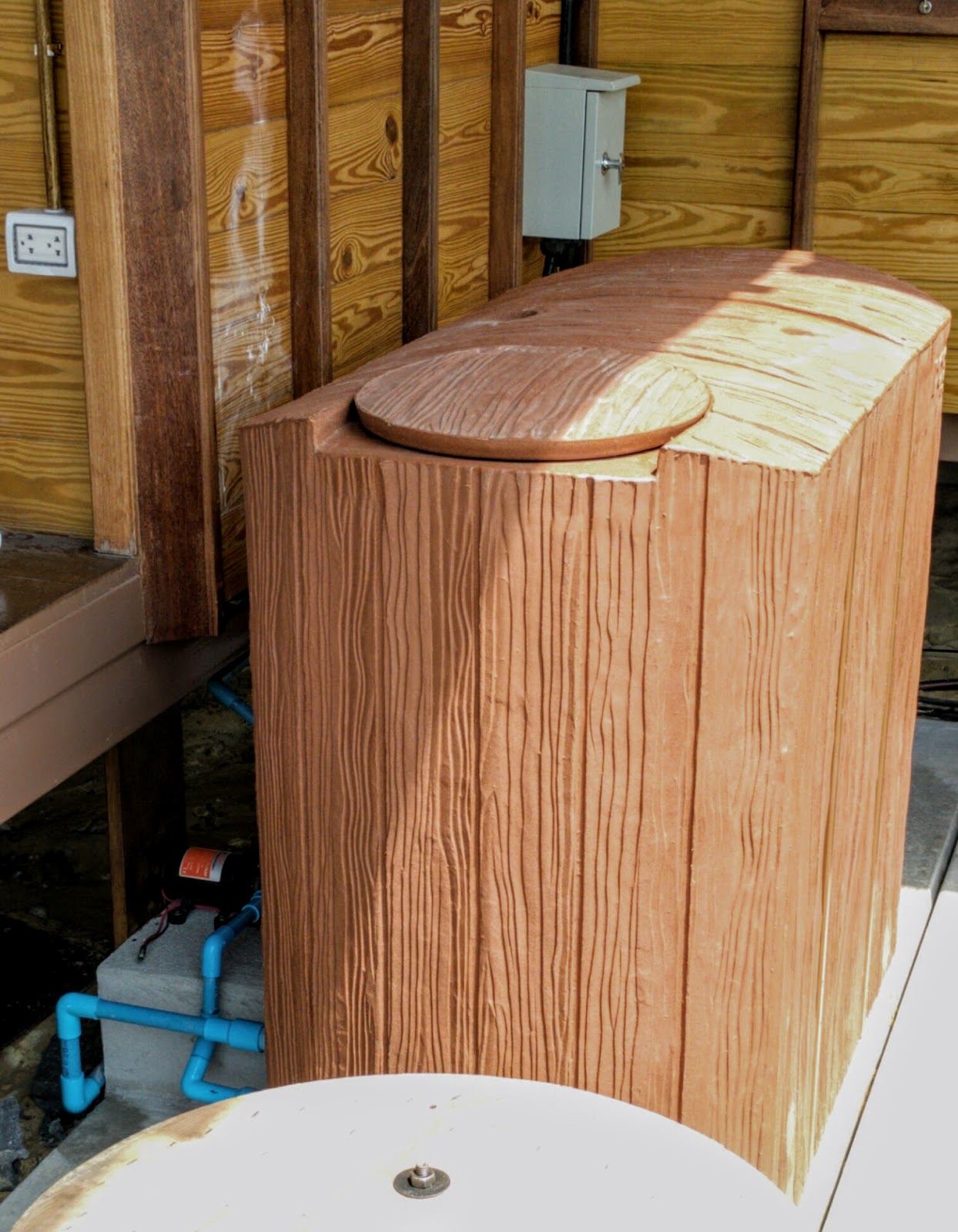 It is a plastic tank that has a fake “wood plank” look. It isn’t the most beautiful thing in the world, but we thought it fit in with the style of the house a bit better than a giant round black one.