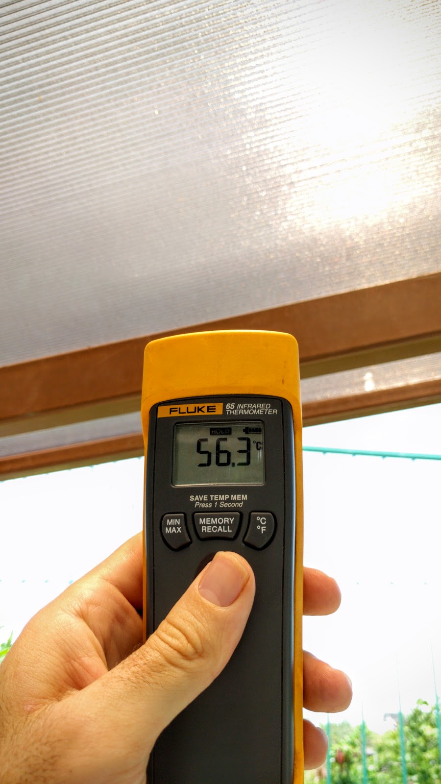 This is compared to 56.3C on the nearby polycarbonate parking area roof that doesn’t have any cover: