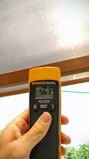 Yesterday, I posted about my test of the two insulation options I’ve been considering. So I also decided to compare those results to the insulating properties of thatch roofing we have around the land. The sheds that we built for the pond circulation pumps have a polycarbonate roof covered in about 2 layers of loose thatch: