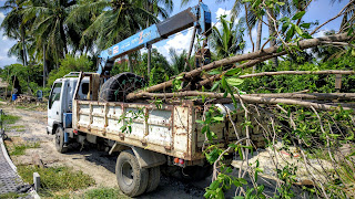 | Bringing in the trees on the back of trucks |