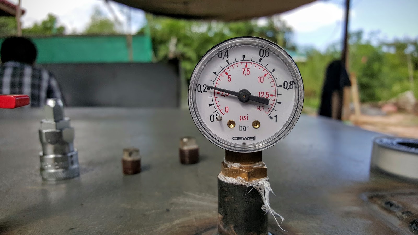 On the left side is the valve and attachment where we connect the air pressure pump. In the middle is the pressure gauge. And on the right is the larger pipe connection which allows me to look inside.