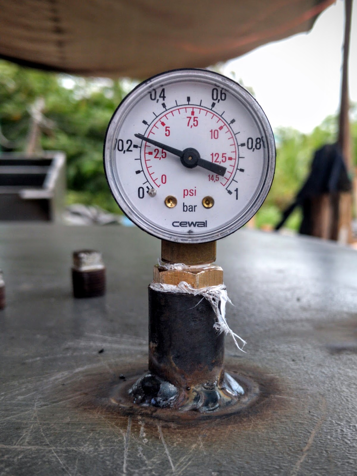 You can see that the gauge has dropped from about 3.5psi down to about 3psi. This was actually much better than I hoped for the very first test. Kudos to the welder!