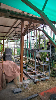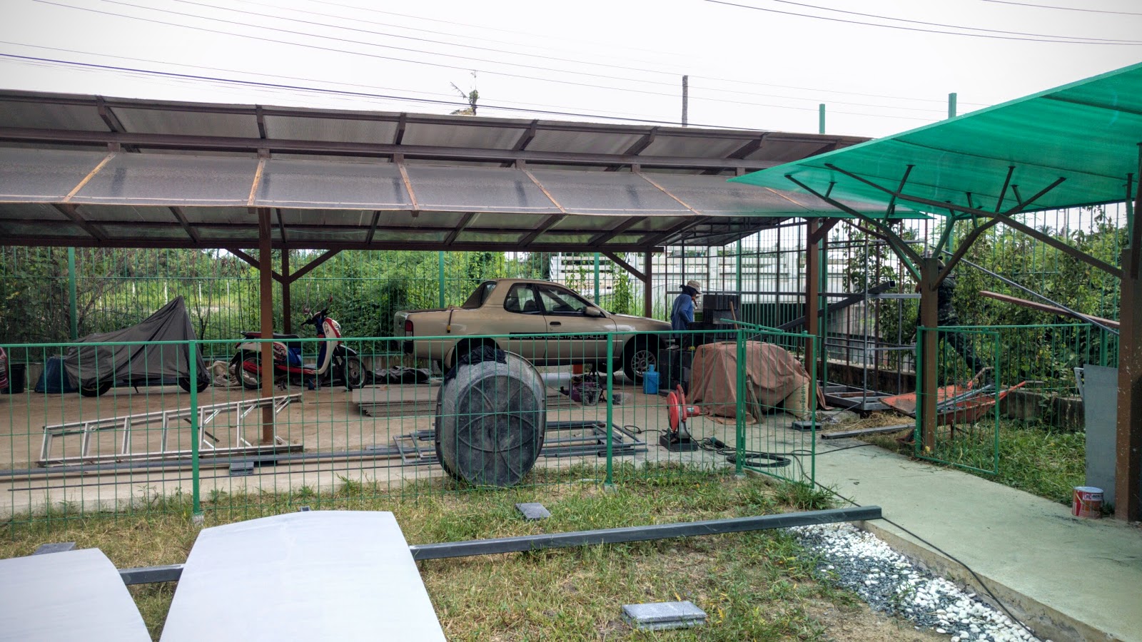 It was always part of our plan to build a storage shed at the end of the parking area that would also block the rain. So we planned it as the next job for the welder after the pontoons.