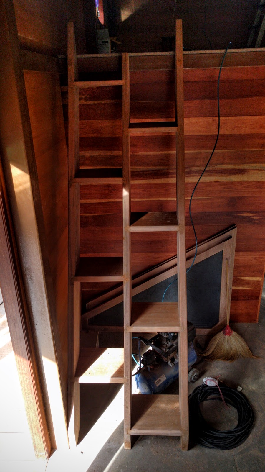 So, the ladder that we started building to climb up to the loft area in BaanRimNaam is nearly complete. It is more heavy duty than I expected. Maybe a little over-engineered. But it is still removable. And it is as sturdy as you can possibly imagine.