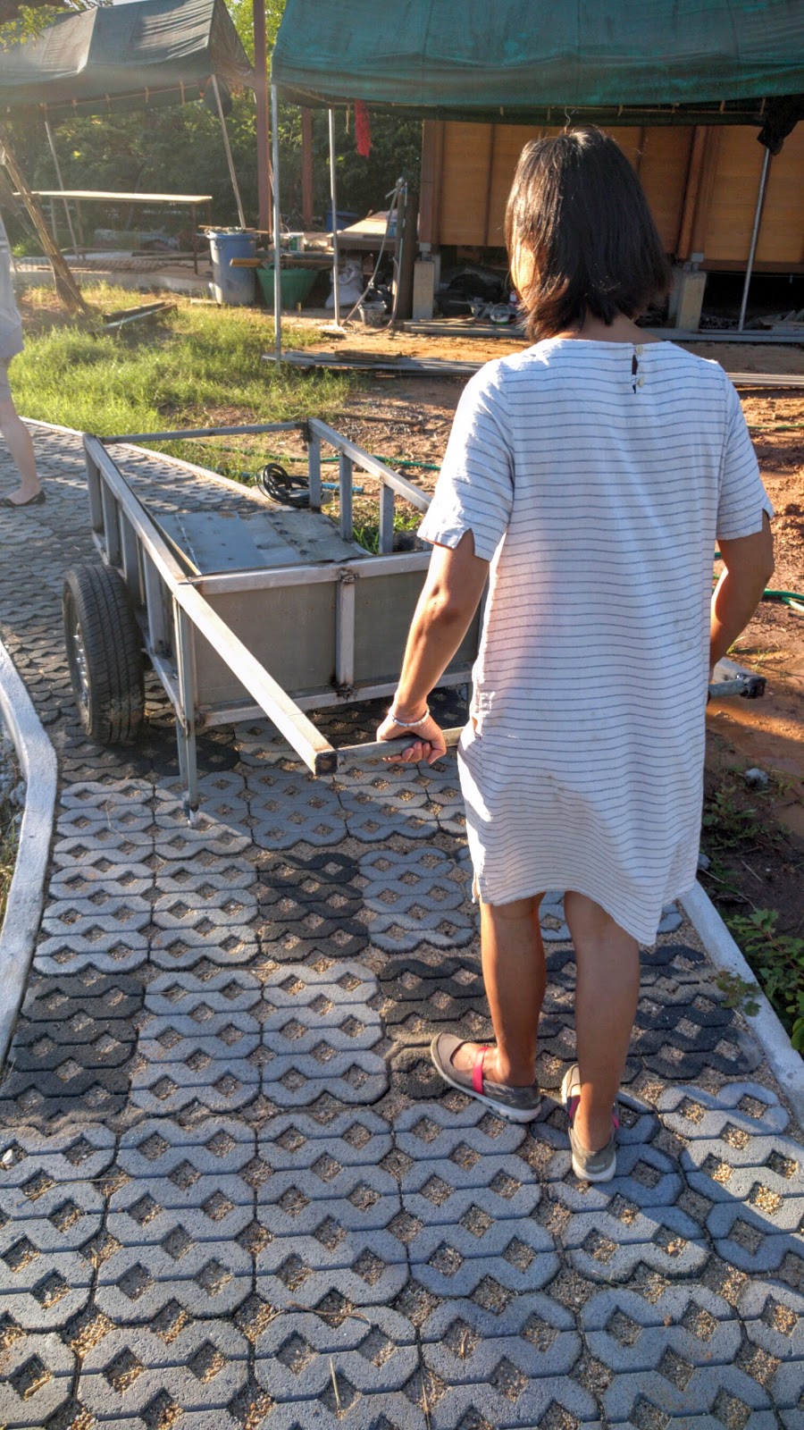 I mentioned previously that I wanted a push cart or wagon of some sort to push heavy things around the land on the walkway. We saw a nice example with the workers that brought the trees.