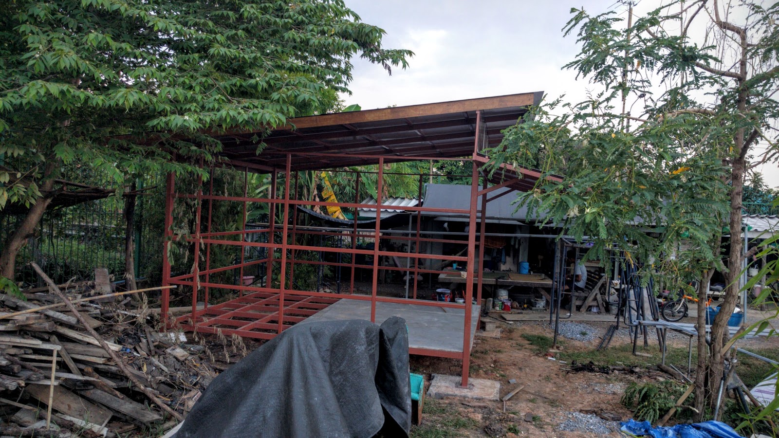 While the size being about the same is just coincidence, I think both the new BaanLoiNaam and the tool shed design are derived from the parking area we built at the end of last year. But since they are so similar, it gives us a chance to sit down inside the tool shed and imagine what it would be like to live in such a small space. At least until they put all the tools in.