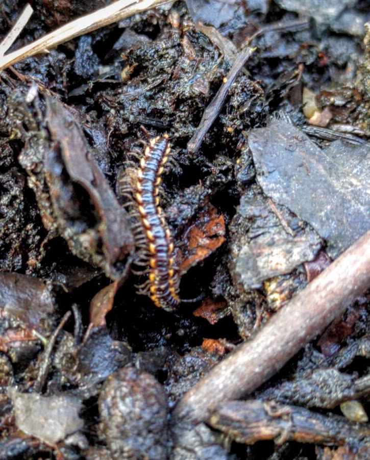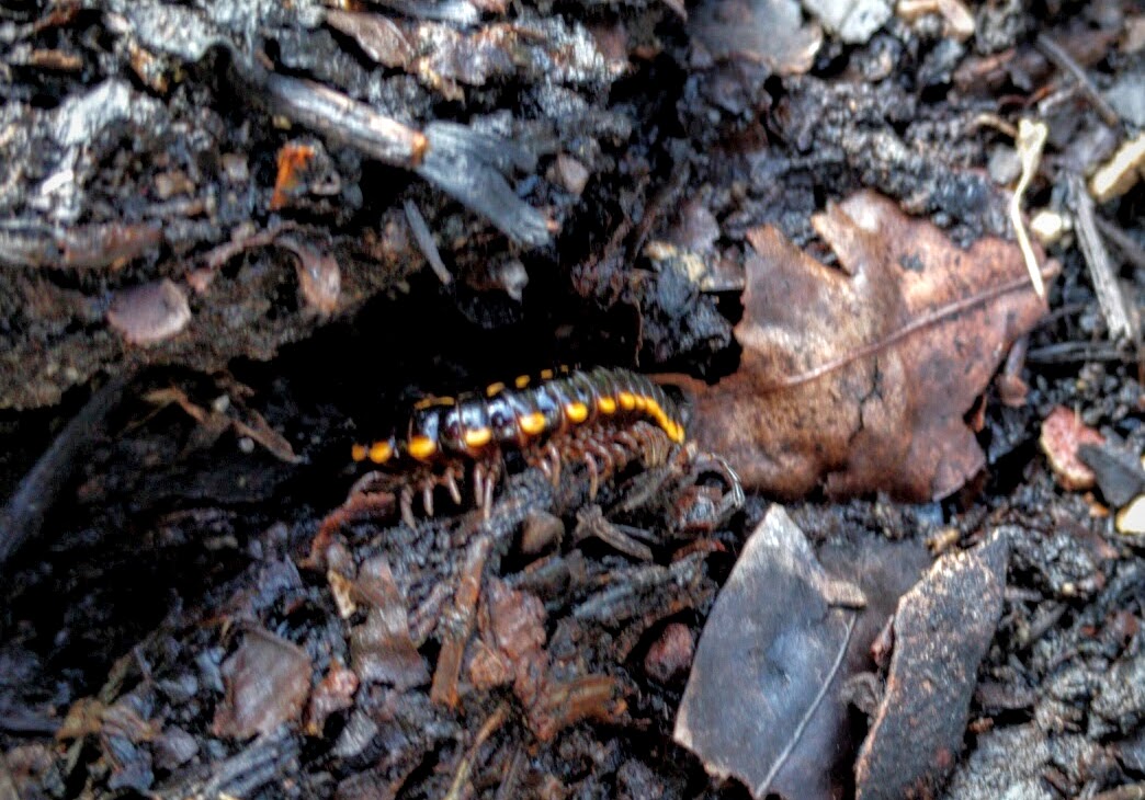 Unfortunately, we found that a strain of rather frightening looking black and yellow tipped millipedes seems to like this area for itself: