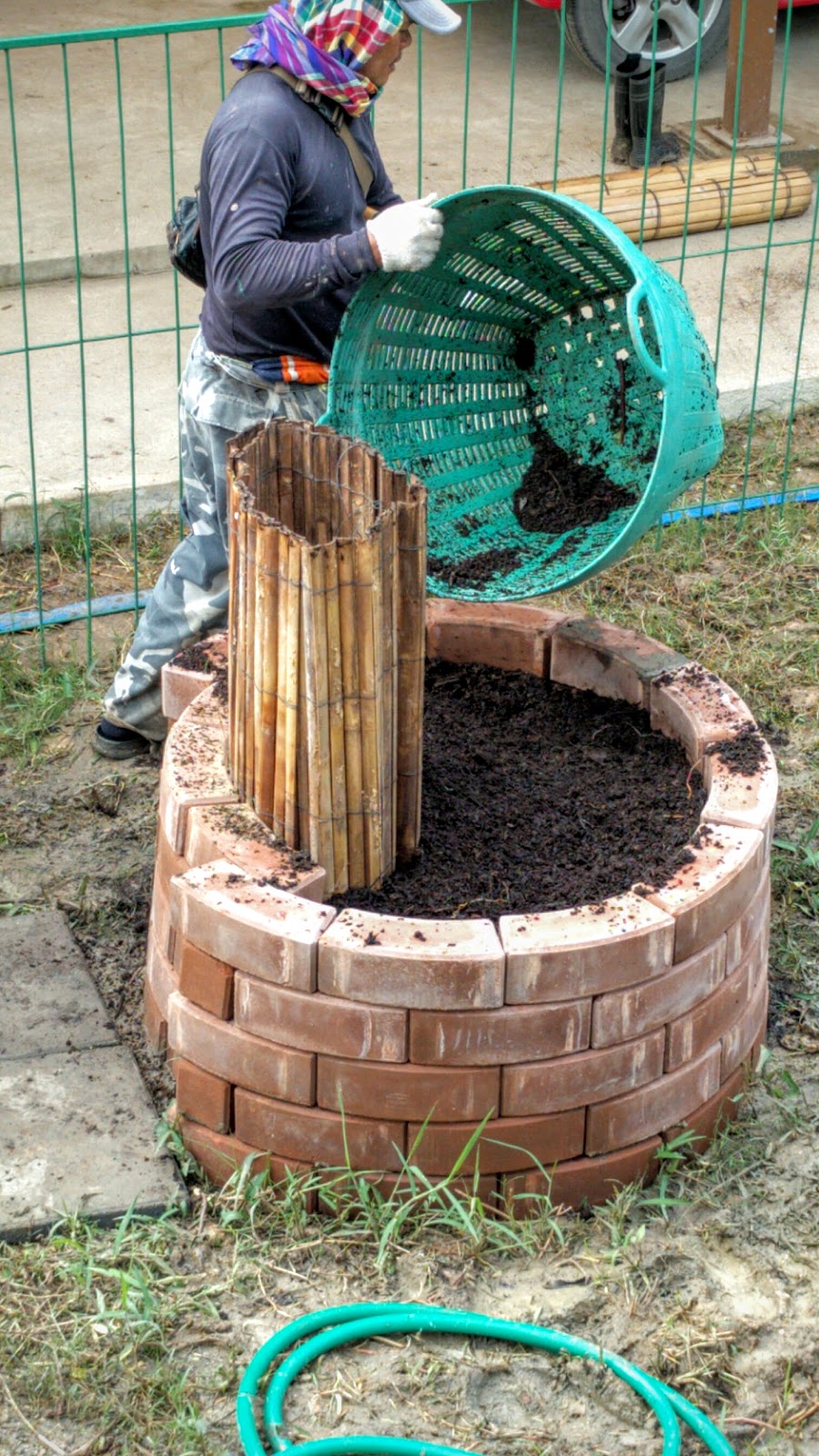 Then we put in an old moldy outdoor bamboo curtain to make a roughly circular area in the center where you can throw kitchen scraps and other compostable materials: