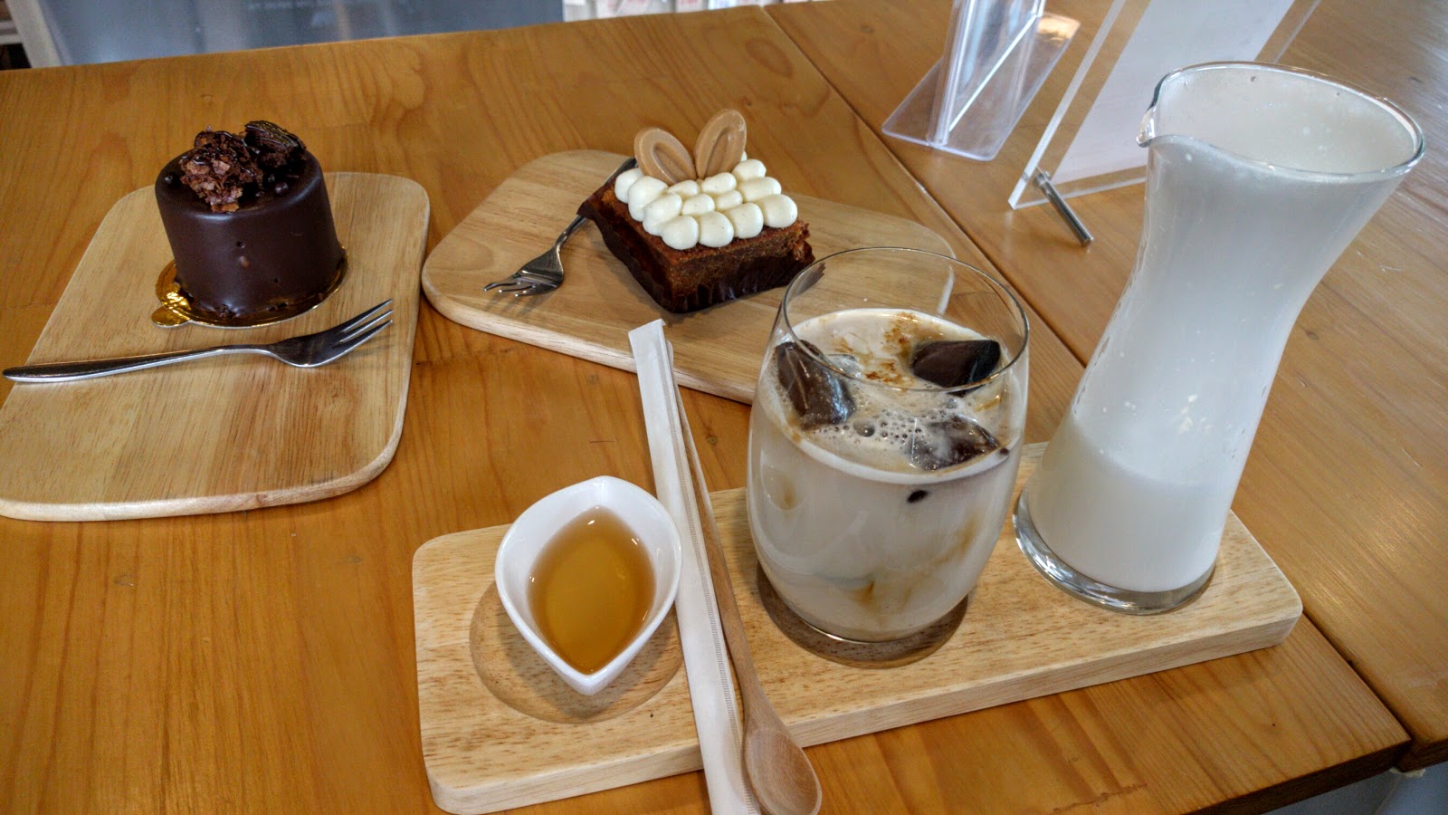 The drinks also looked quite interesting. Praew enjoyed their “coffee on the rocks” which comes as a carafe of milk, a glass of ice cubes made from coffee and a small dish of syrup on a wooden tray. (This picture is after pouring the milk over the ice cubes…)