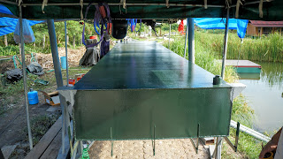 You can see the two sliding rails on the ground near the center of the pontoon. These will be moved to left and right sides of the pontoon so we can slide the pontoon down into the water.