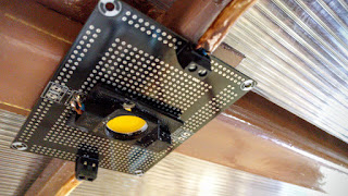The ceiling lights have gone through a few iterations. The key is that need for a heatsink. We settled on a PCB design that makes mounting the LED easy (solder it on), but also makes wiring easy. The LED is wired to a +24V and GND trace and then wiring connectors are added depending on the configuration around the particular light. Connectors can be added in each of the 4 sides to make end lights (1 connector), straight throughs (2 connectors opposite each other), 90 degree turns (2 connectors 90 degrees from each other), Y splits (3 connectors), or even 4 way junctions. Here is one with the plastic cover removed: