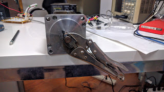 We limited the current to just 2.5A in order to apply an observable but not dangerous amount of torque. Here we affixed a vice grip to the motor so you can see the angle: