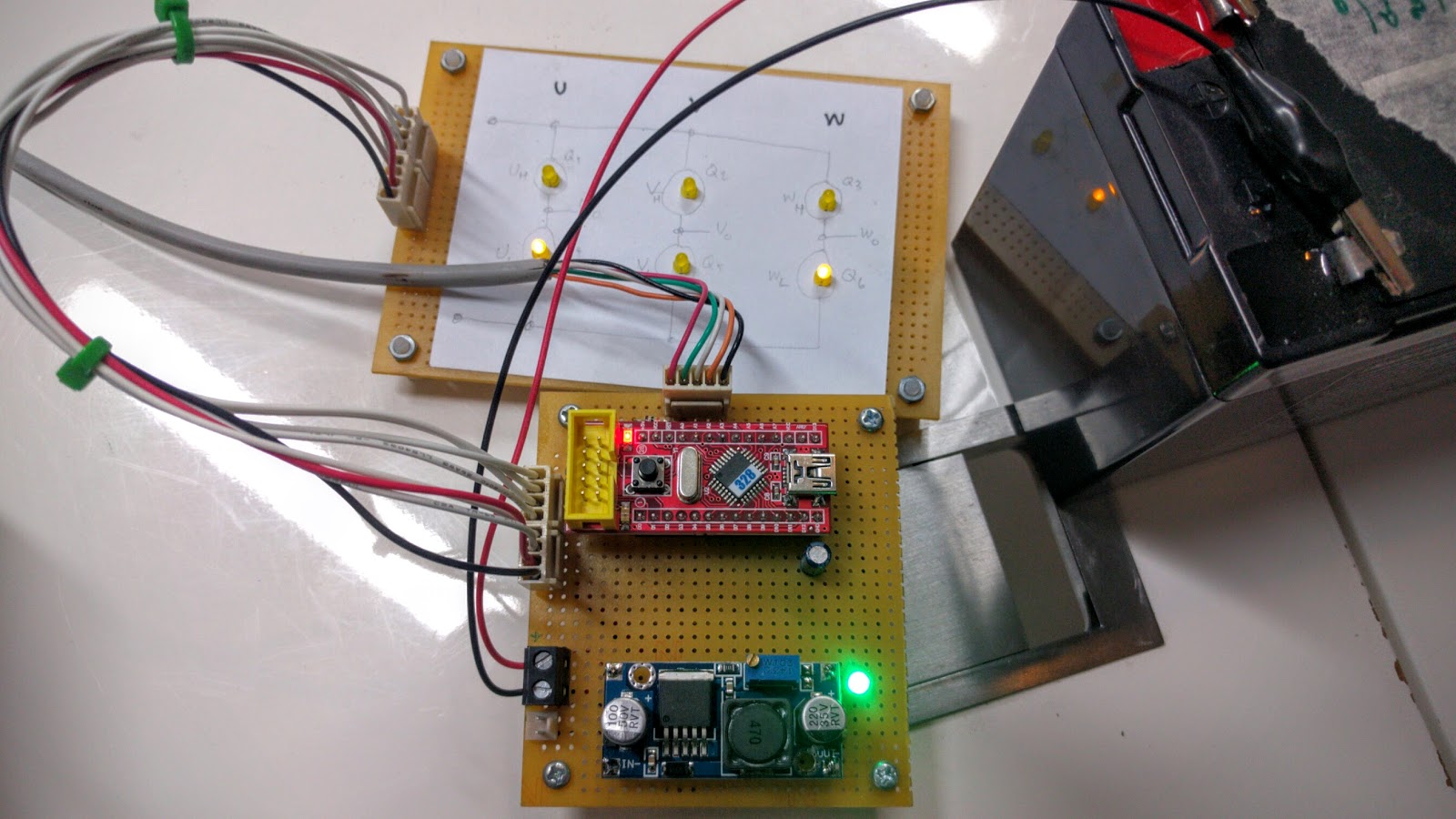 The left is a 12V lead acid battery, the perf board in the middle bottom has an ATmega328 board (red) with a DC-DC stepdown converter (blue) to supply the 5V to the ATmega. The white board above it is simply 6 LED’s that are connected to the pins which will drive the gates on the 6 FET’s we will be connecting up to later. The LED’s allow us to observe the logic as we rotate the motor to make sure we get the sequence and timing (“commutation”) right. To the right of the white board with the LED’s is a black USBASP USB programmer for the ATmega. In the upper right is a Golden Motor BLDC motor (24V 300-400W if I remember correctly).