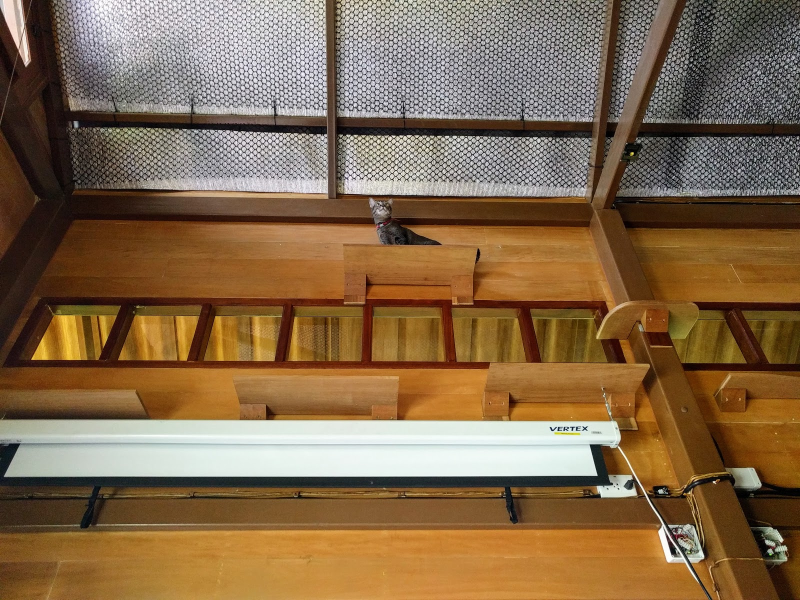 As you can see from the last one, I went and hung a projector screen from the “cat shelves” as well. I’ve always been a big fan of projectors as relatively inexpensive giant big screen TV’s that take up almost zero wall space when not in use. In this case, the screen covers a door when in use, and folds up above it when not.