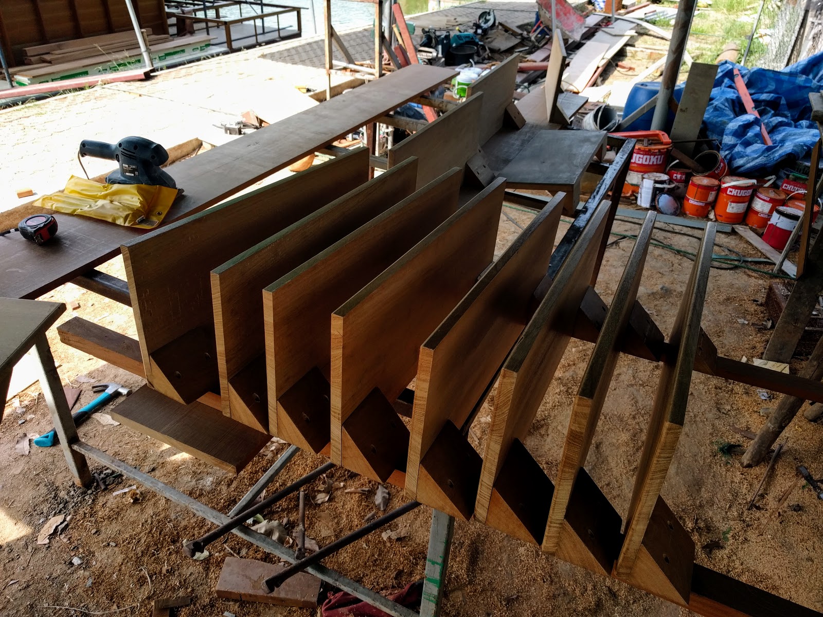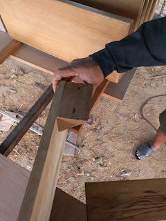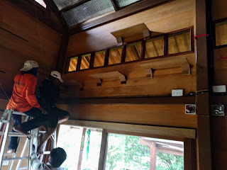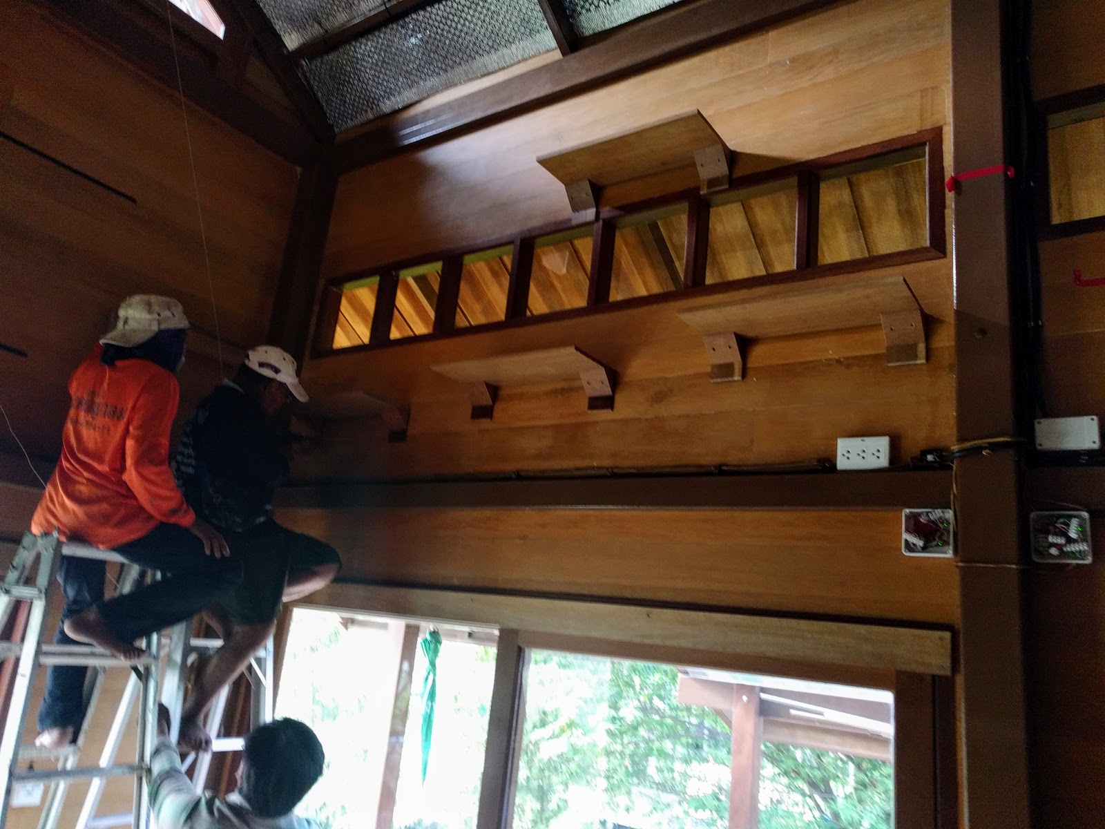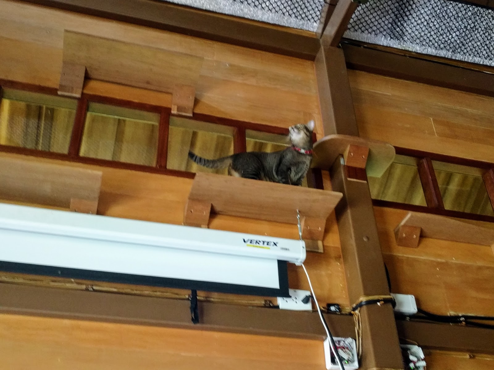 Both the dogs and the cats are sleeping inside in a very small house, but we figured the dogs can’t climb the alternating step ladder to the loft space. So the cats have their own space to get away from the dogs, but they still end up coming down and hanging out with the dogs when we are around. Nonetheless the loft is a bit small, so we decided to build out a little more vertical space for the cats and figured we should do it before the cats move in. So last week we got the workers to build a number of “cat shelves” into the walls around the main living room area.