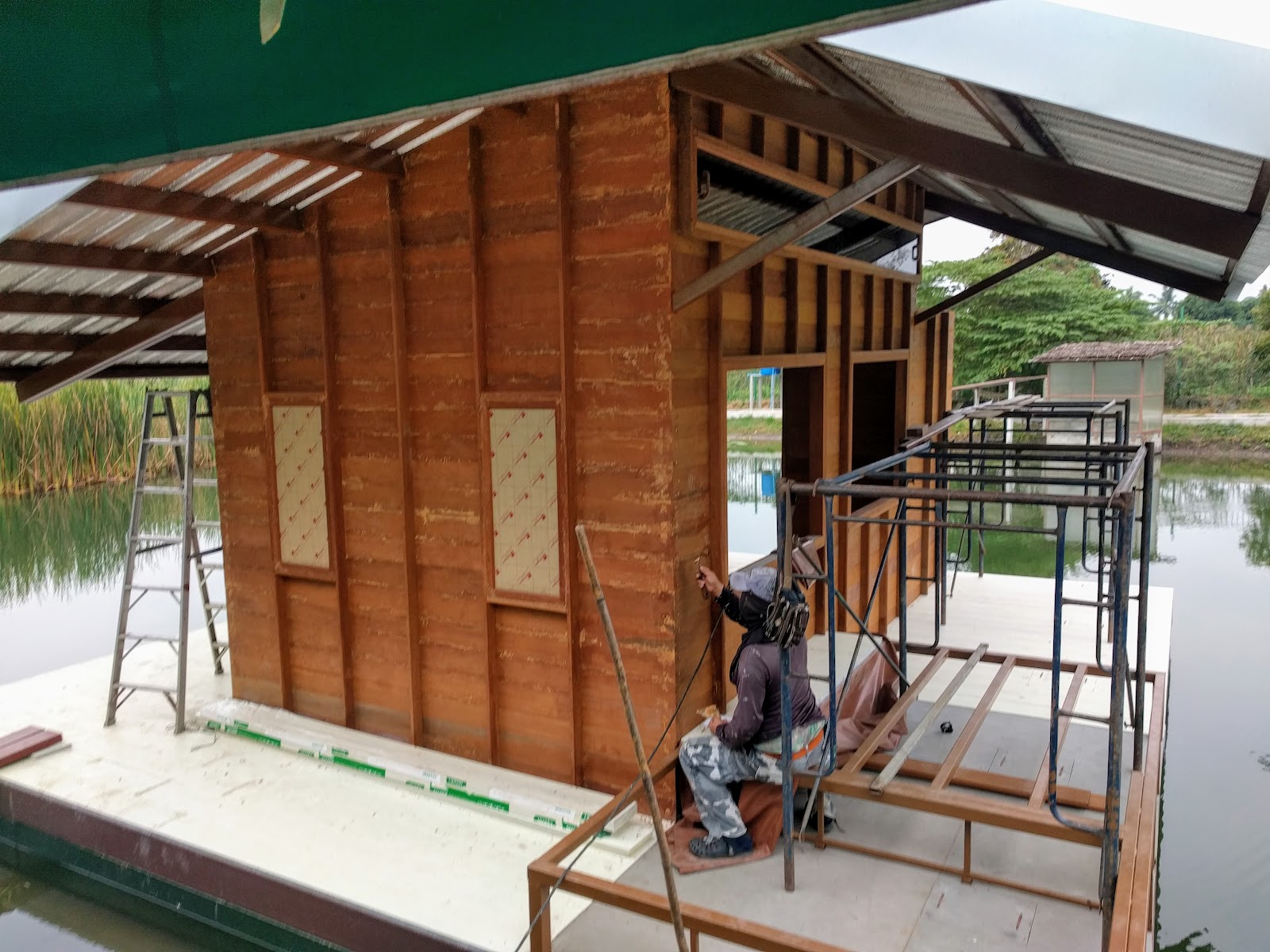 Since the houses we are building are all wooden, and they use tongue-and-groove connections between the wooden planks in the walls, there are always slight imperfections in the fit between all of the wooden planks in the walls. These are filled in manually using a mixture that the workers call “bo” but probably translates as “wood filler” in English. I believe it is made from a mixture of fine sawdust from cutting and sanding the wood and wood glue.