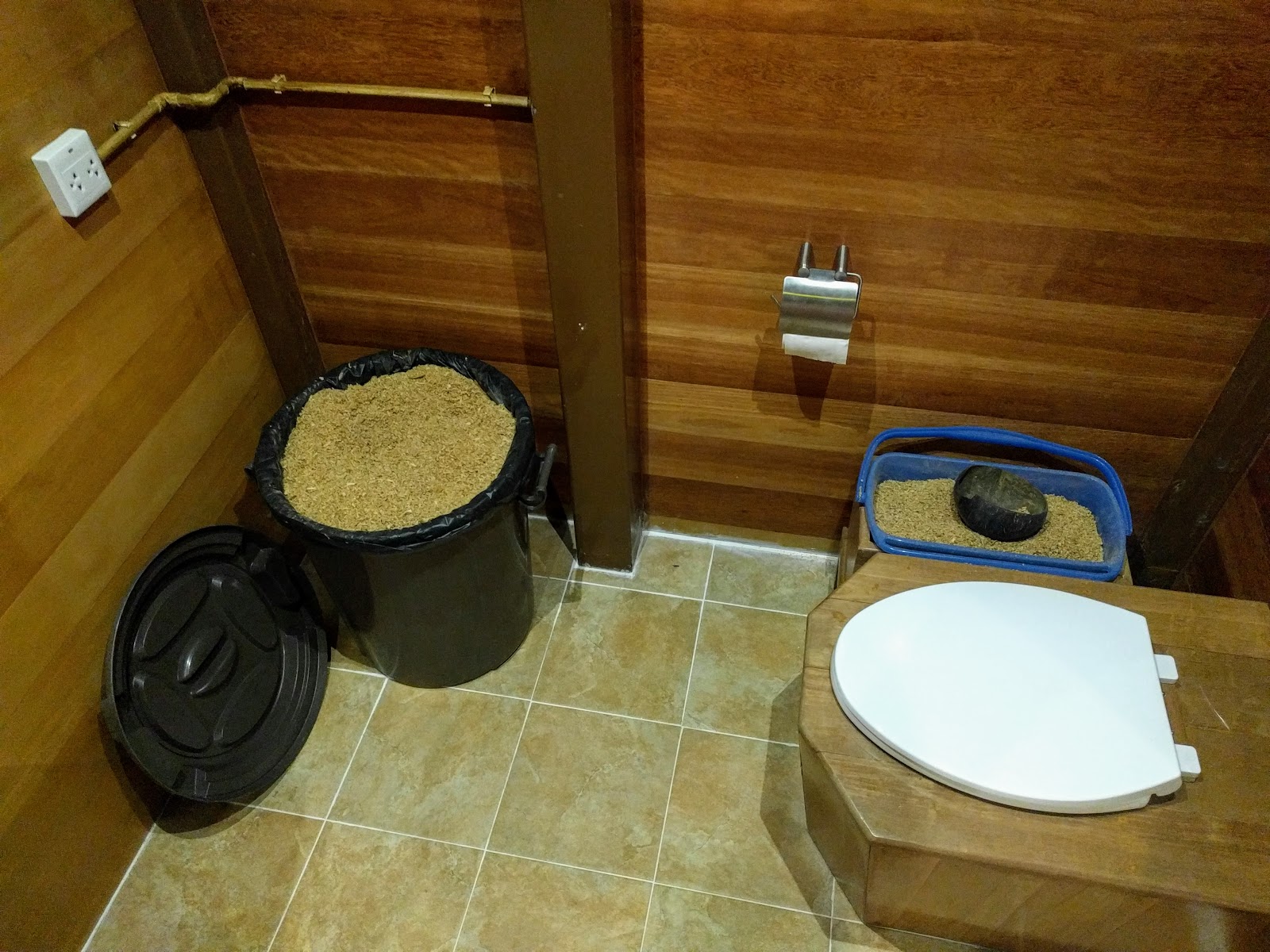 This sawdust is kept in a bucket next to the toilet along with a coconut husk scoop: