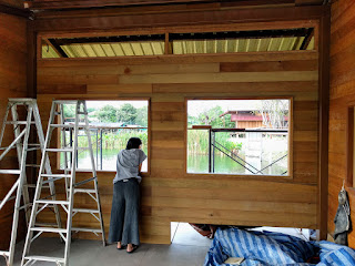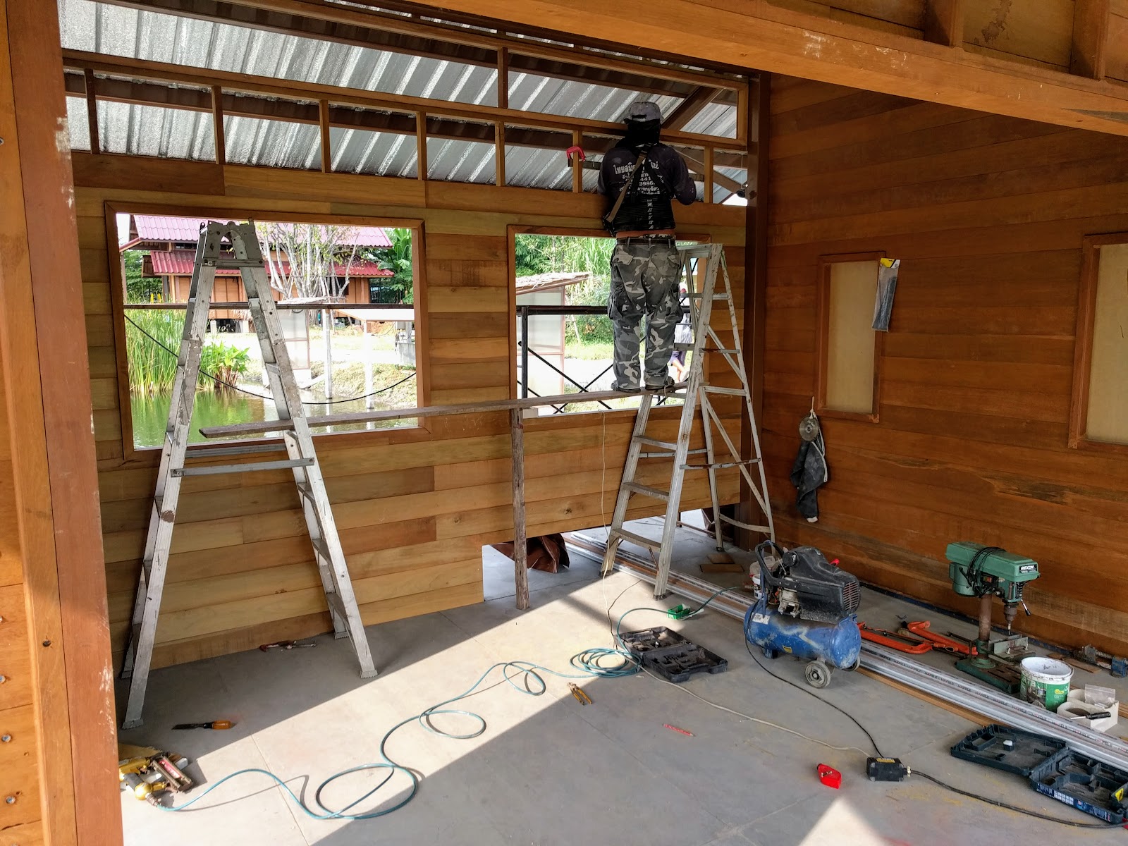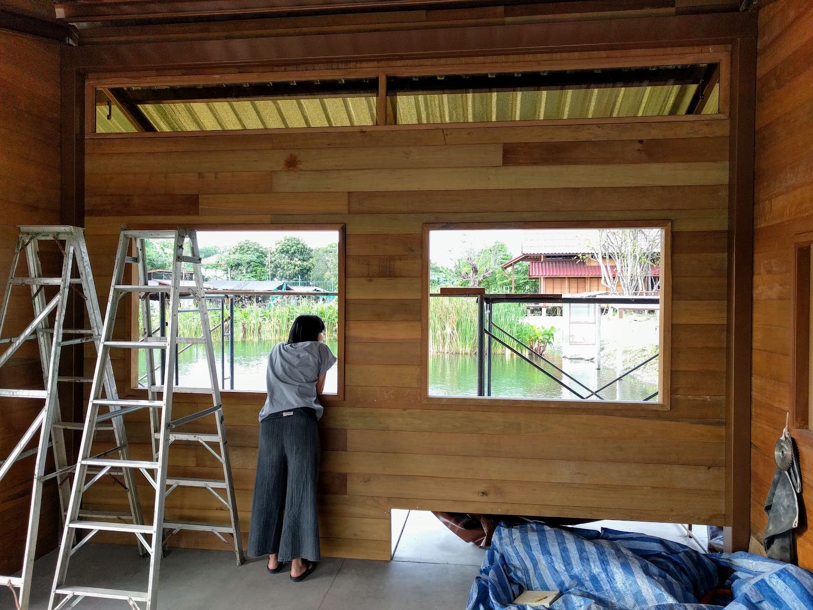 We used the same slightly yellowish brown tinted acrylic that we used for many of the windows in BaanRimNaam. (The color in Thai is called “tea color”, which has a pleasant sound to it also.)