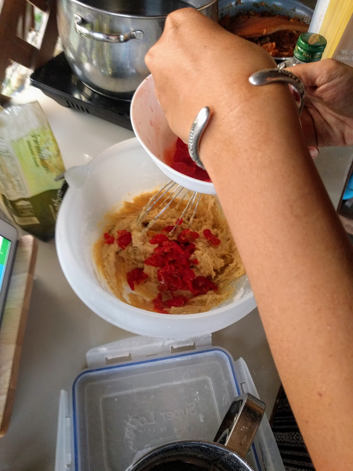Today, she will be making Thai cherry scones. But since we might be overdosing on these cherry dishes now, after this I suggested we take the next bunch we harvest, remove the seeds, and freeze it for later baking or cooking purposes.