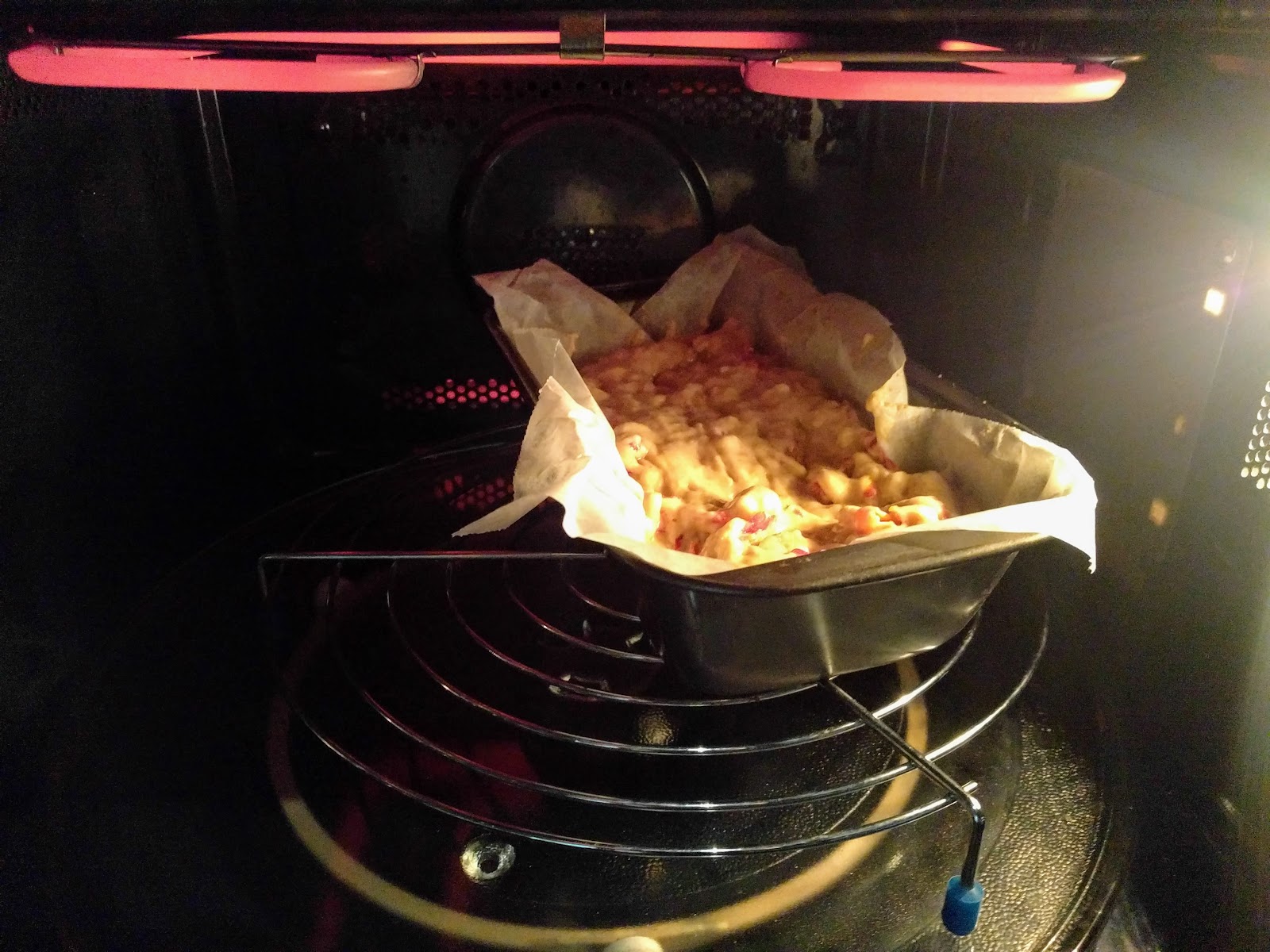 First we started with a “Thai cherry and banana cake”. The basic recipe was from these strawberry banana muffins, but we replaced the strawberries with Thai cherries. It was surprisingly good. The sour tartness of the Thai cherries gave a burst of flavor I don’t think the original strawberry recipe would have.