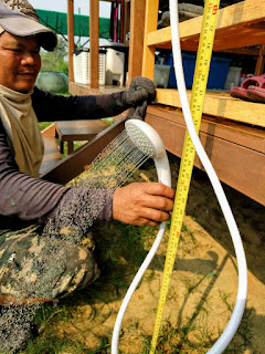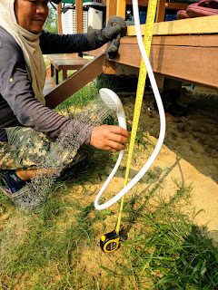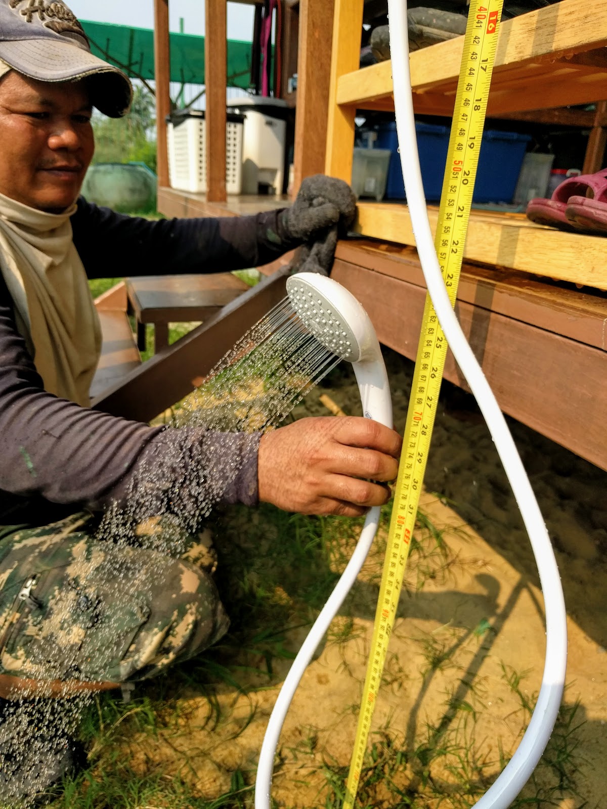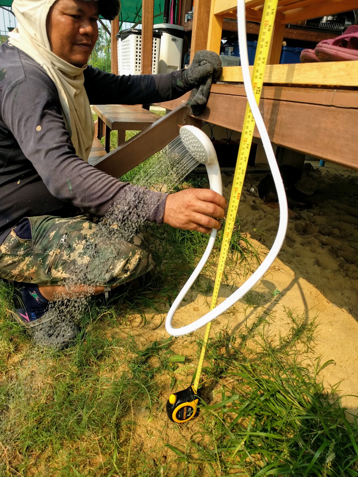 In the shower we are building in BaanLoiNaam, we would like to mount a water tank as high as possible under the roof and use gravity pressure to run the shower and sinks. But the height difference is not all that much, meaning there will not be much pressure. So I figured it would be worth an experiment to determine if the height differential will be enough to feed the water into the house.