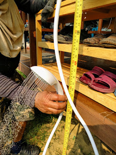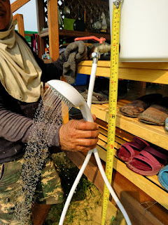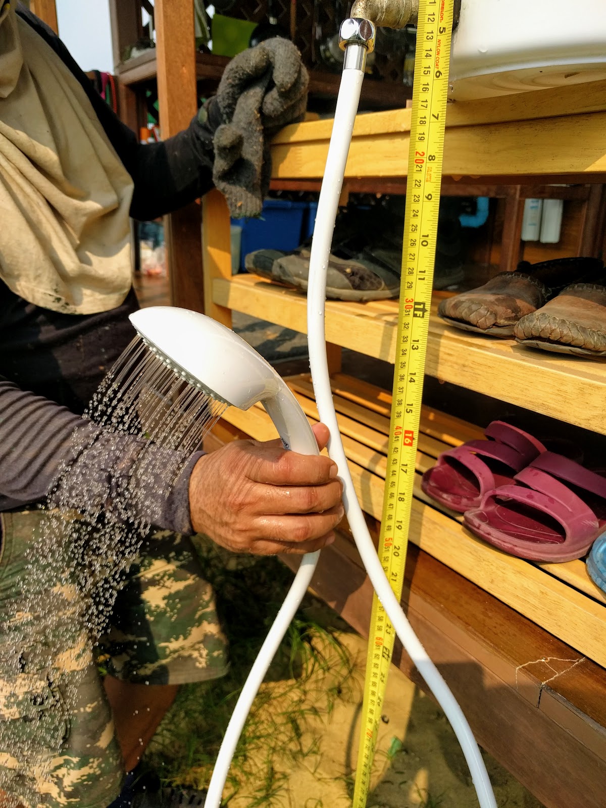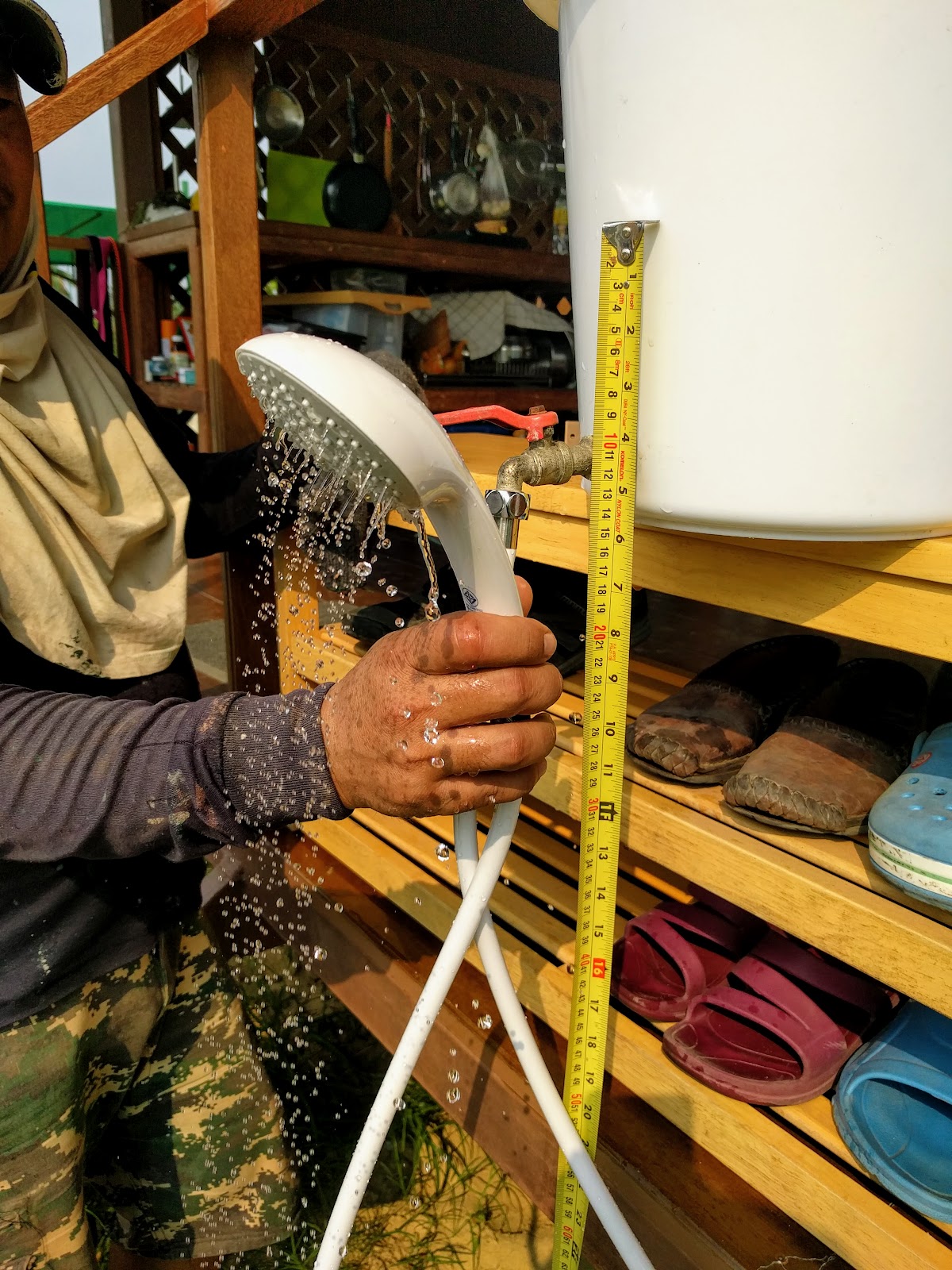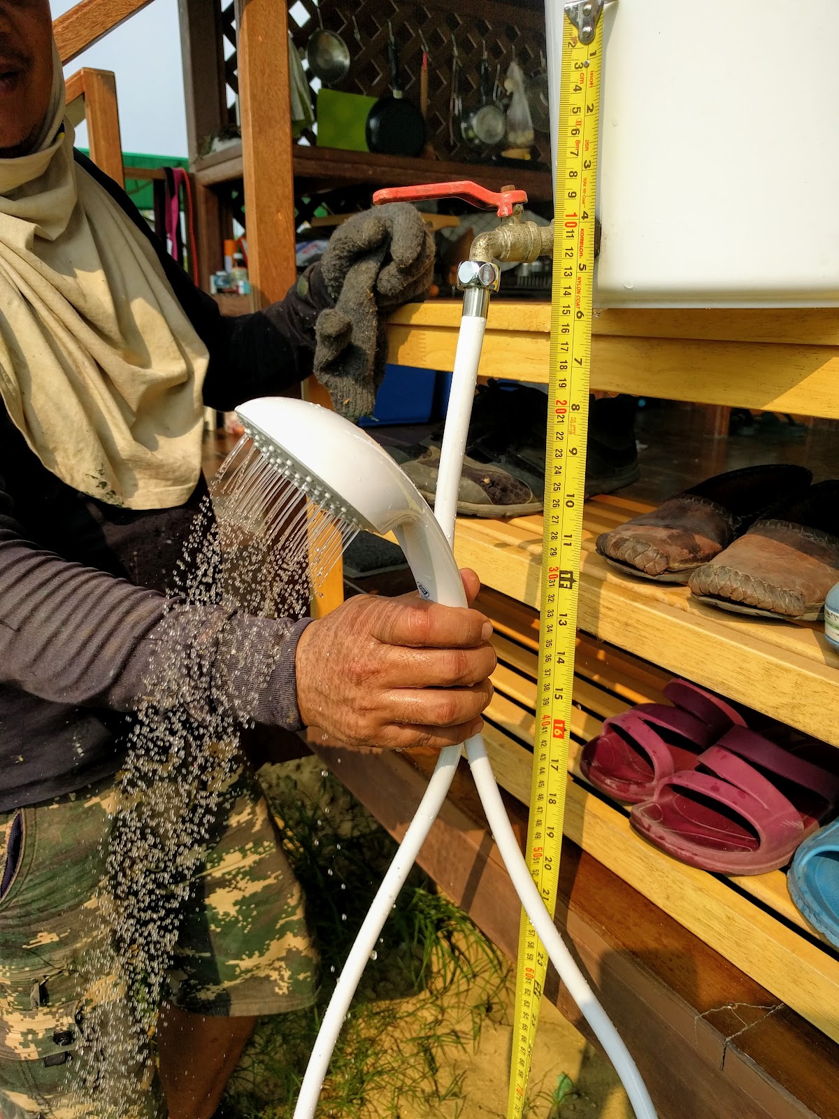 So I asked Than to pick up the cheapest shower head he could find at HomePro the last time he needed to pick something up there and I connected it to a water bucket for this test: