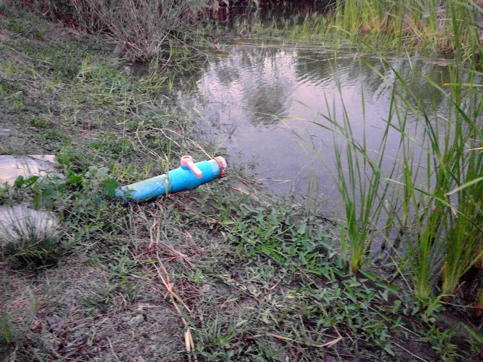 It is hard to make out in the picture given the dimming light, but the water level is about 37cm below the bottom of the overflow pipe.