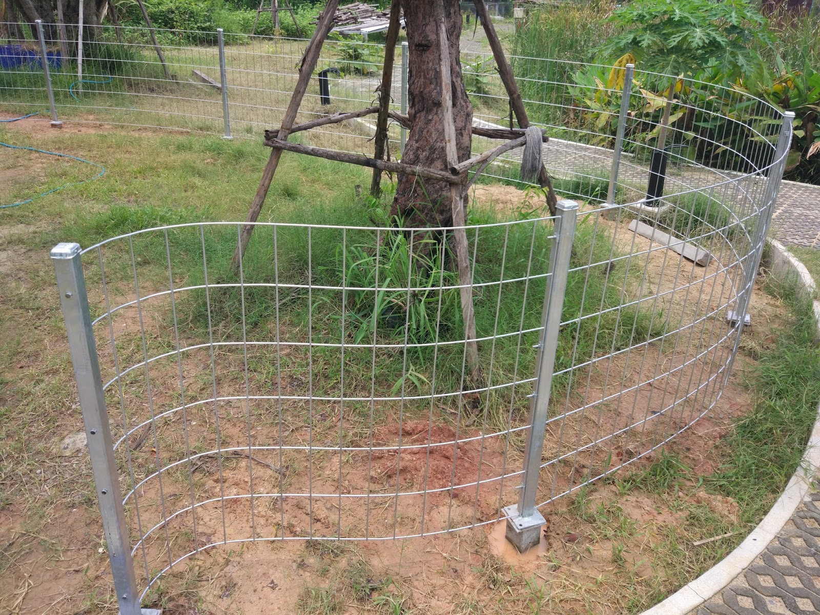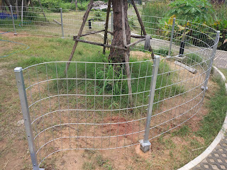 Rather than build it all ourselves, we ordered a factory made galvanized steel fence (G-fence). It is similar to the one we made for BaanMae out of 6mm rebar, but without the square profile steel frame, is galvanized, and arrives fully welded. We just had to put in the poles and screw in the fencing to them.