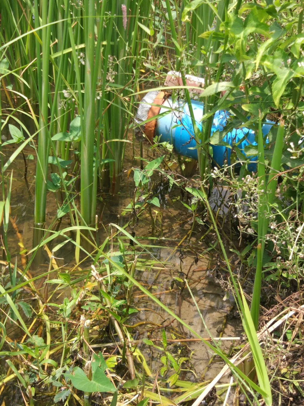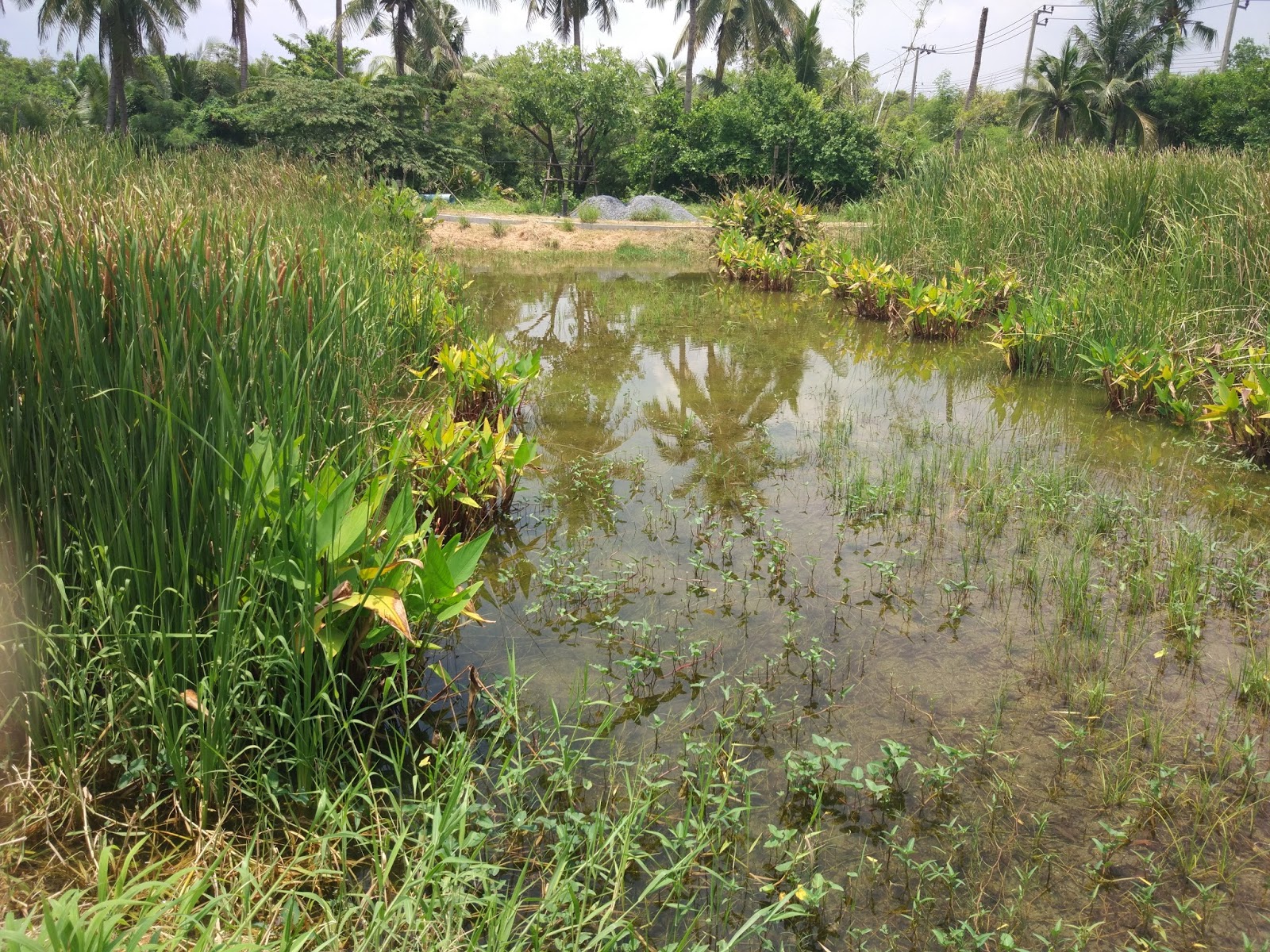 It is hard to see the overflow pipe because the plants have grown around it, but if you look carefully, you can see that the water level is about 10-15cm below the overflow pipe now. Back in March, I measured it at 37cm down, for a difference of about 25cm. This comes out to about 20mm of rise in pond level every 5 days, after subtracting evaporation. (This period of time includes the hot season.)