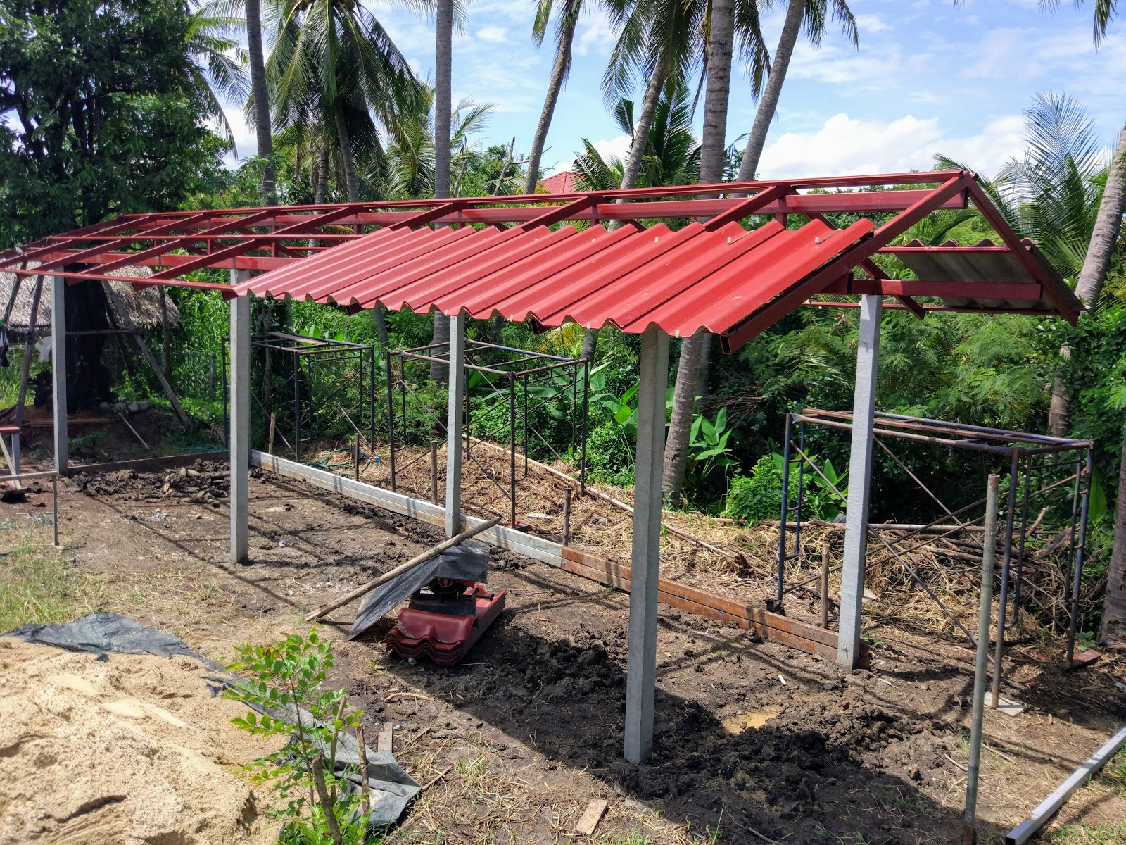 Just for fun, I went for a bright red color paint on the steel roof support beams. I figure that while I want my home to be natural earth tones, a pile of discarded organic matter can use some bright colors to keep it cheery. 😉