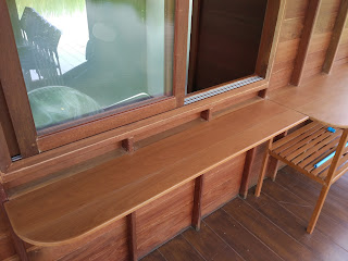 It is a shelf for putting food so someone inside can easily grab it and move to the table. Like a kitchen window in a diner. But it folds down to move out of the way if we prefer the space to be clear: