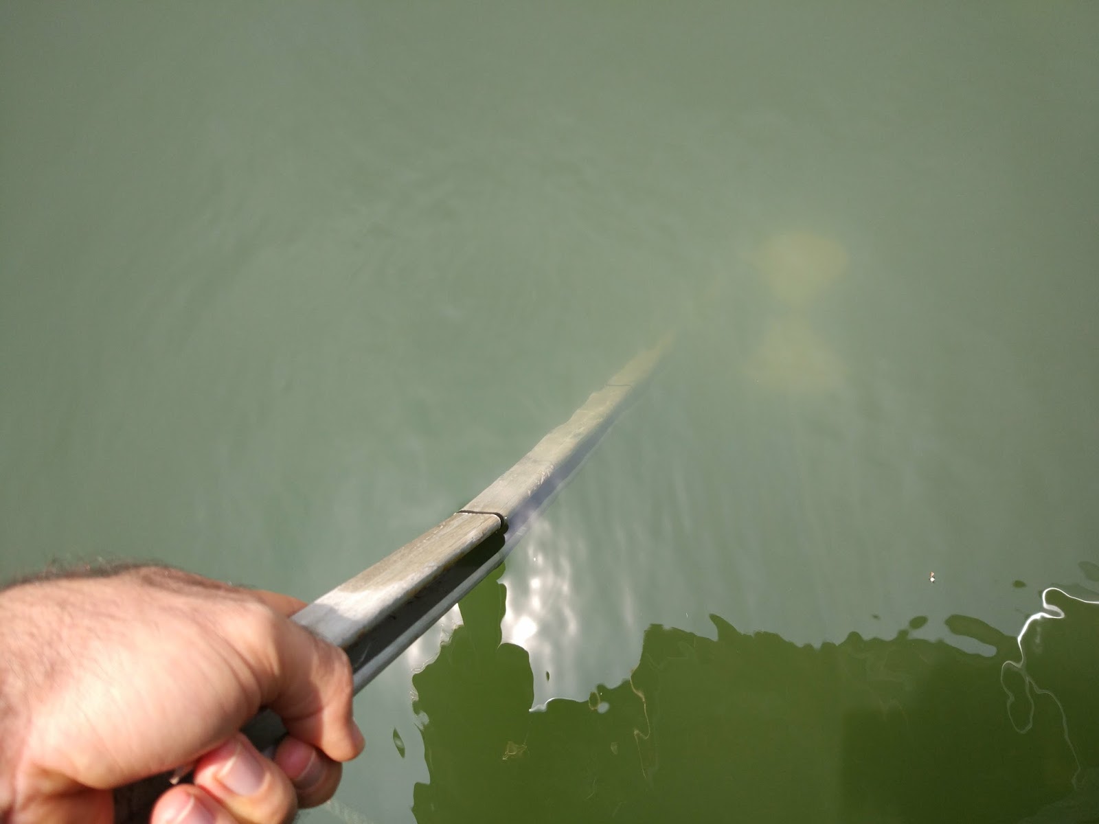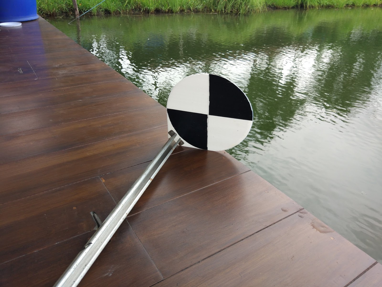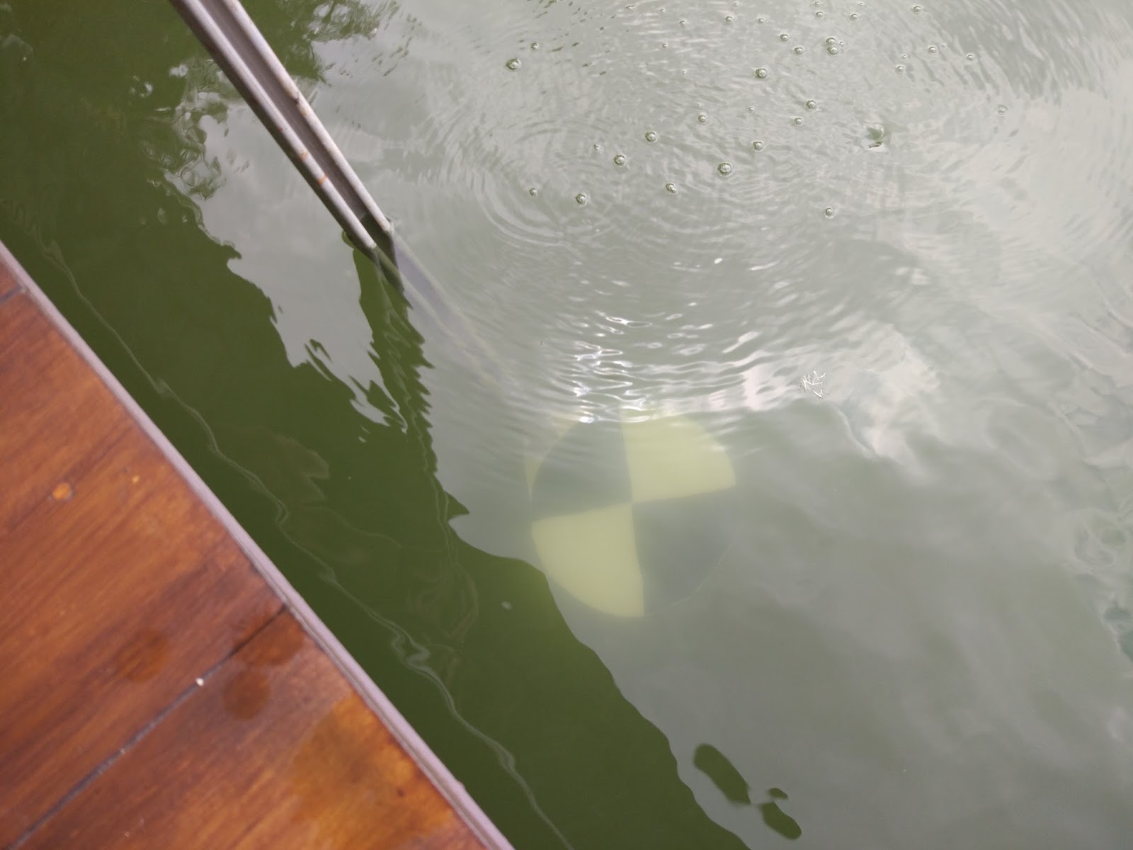 The idea is to push it into the water until the disk just disappears and measure how deep it is. We added tape marks on the rail at 1m and 1.5m to assist in measuring depth.