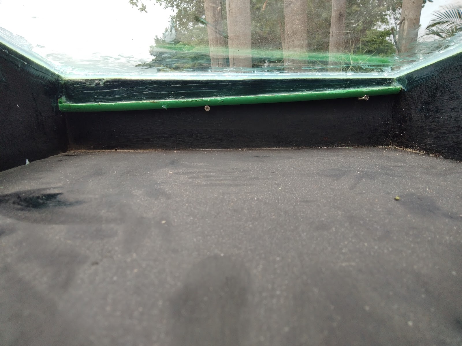 We added silicone on the wood surface between top edge and the pipe to guide water down to the pipe. then added the glass on top, sealing every edge with silicone.