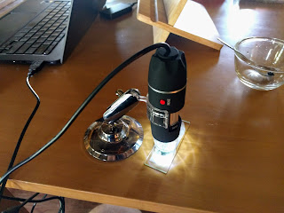 So I started out by seeing what it looked like under a microscope. This involved buying a cheap microscope off of Lazada. It cost a little more than 600 THB (less than $20) and worked right out of the box on Linux. (It uses that standard UVC camera driver.)