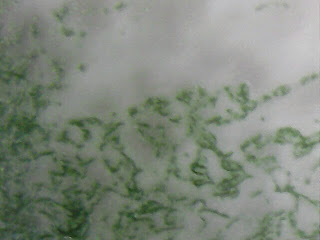 Based on that last image above, I measured the loose spiral like shapes as having a filament width (cell size?) of about 6 pixels, which comes out to about 9 microns. The length of one of the loosely coiled filaments was about 60 pixels, which comes out to about 90 microns. So this is certainly consistent with the scale of a spirulina trichome.
